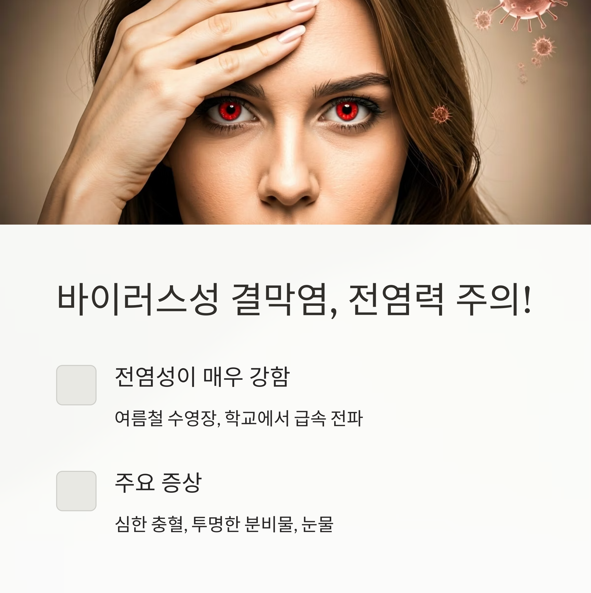 특히 바이러스성 결막염은 각막 혼탁을 초래할 수 있어 주의가 필요합니다.