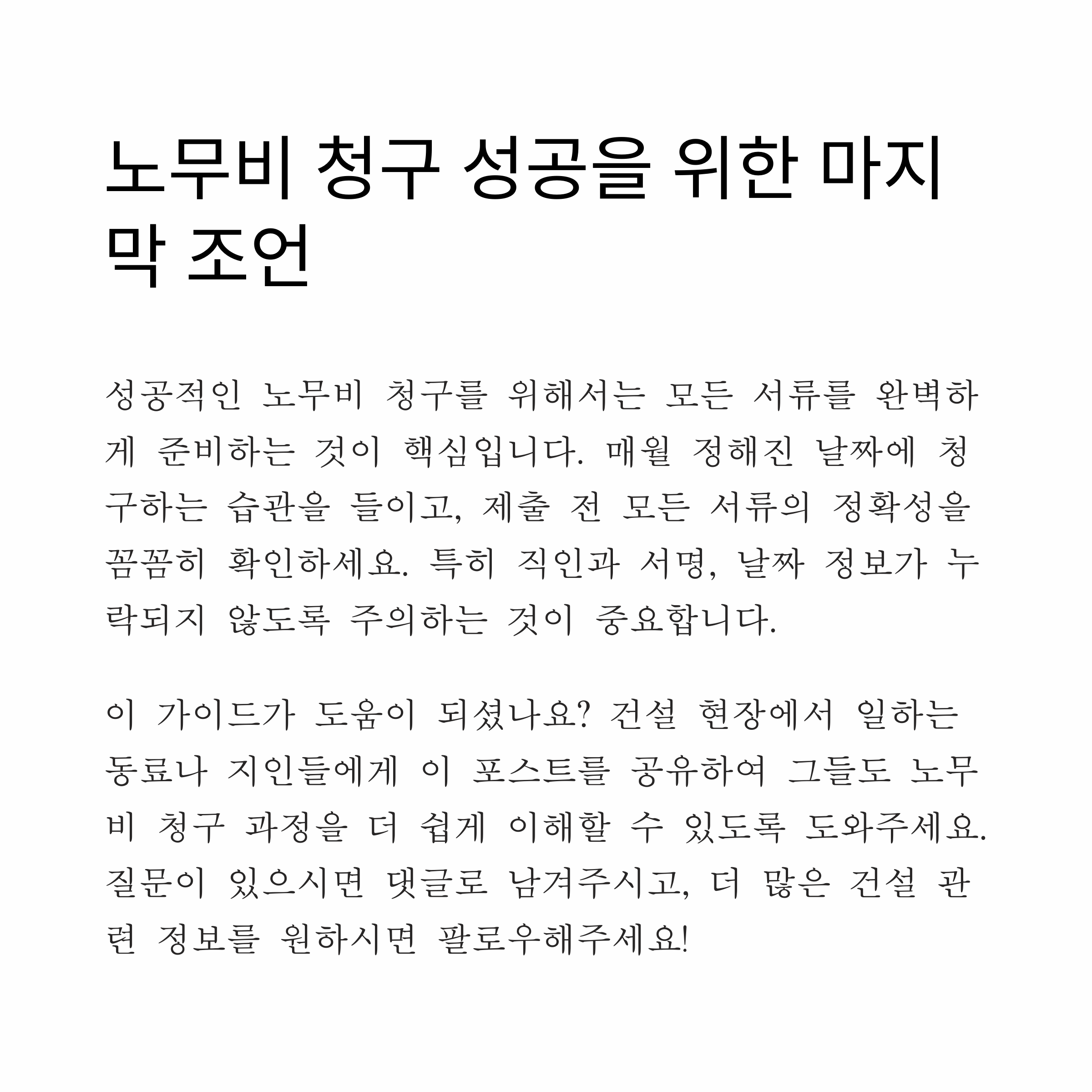 실제 현장에서 사용 중인 노무비 청구 팁이나, 자주 발생하는 실수 사례가 있다면 댓글로 공유해주세요. 다양한 현장의 경험이 더 나은 가이드를 만들어갑니다.