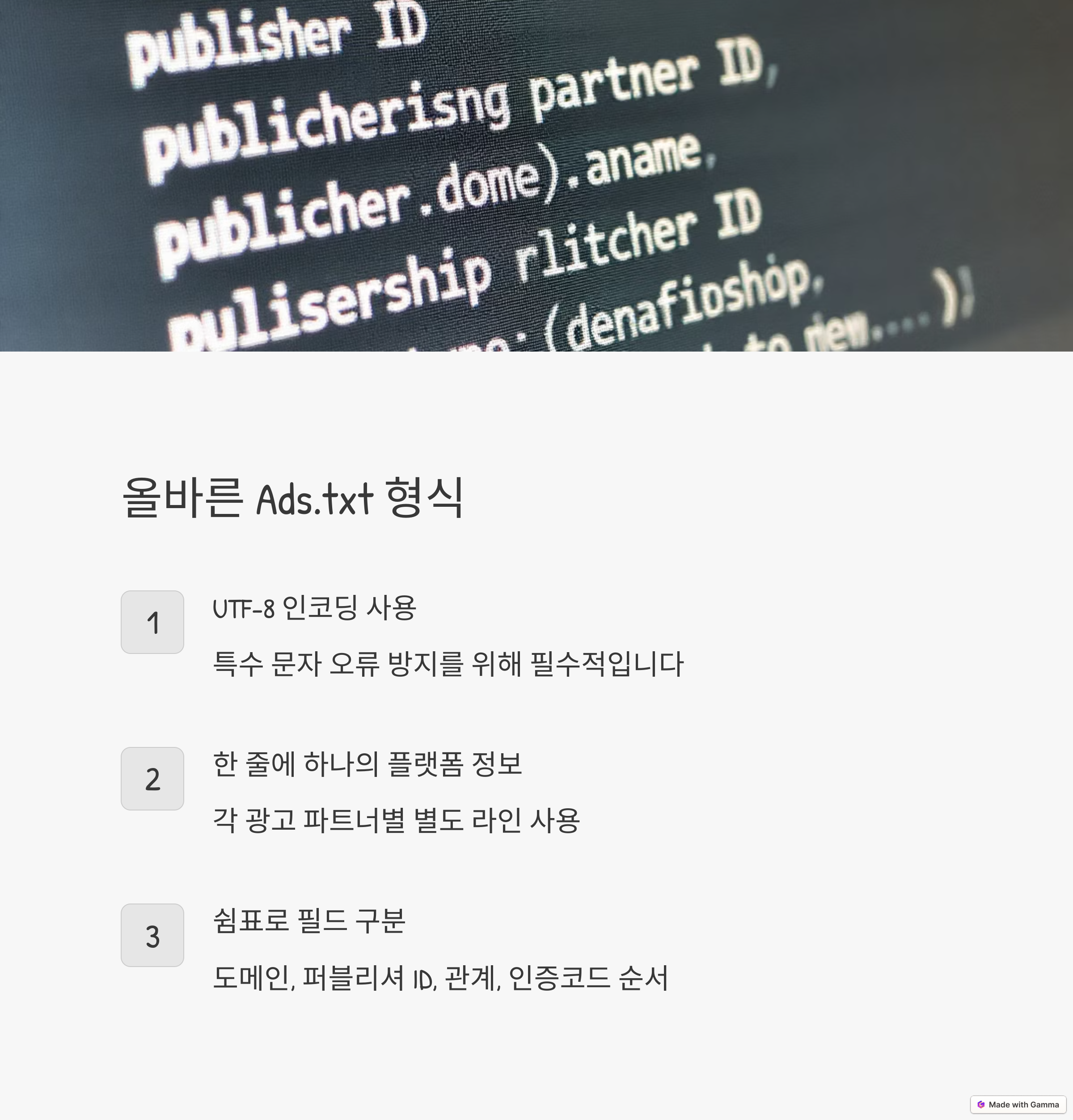 - ads.txt 파일은 UTF-8 인코딩을 사용하는 텍스트 파일이어야 합니다.