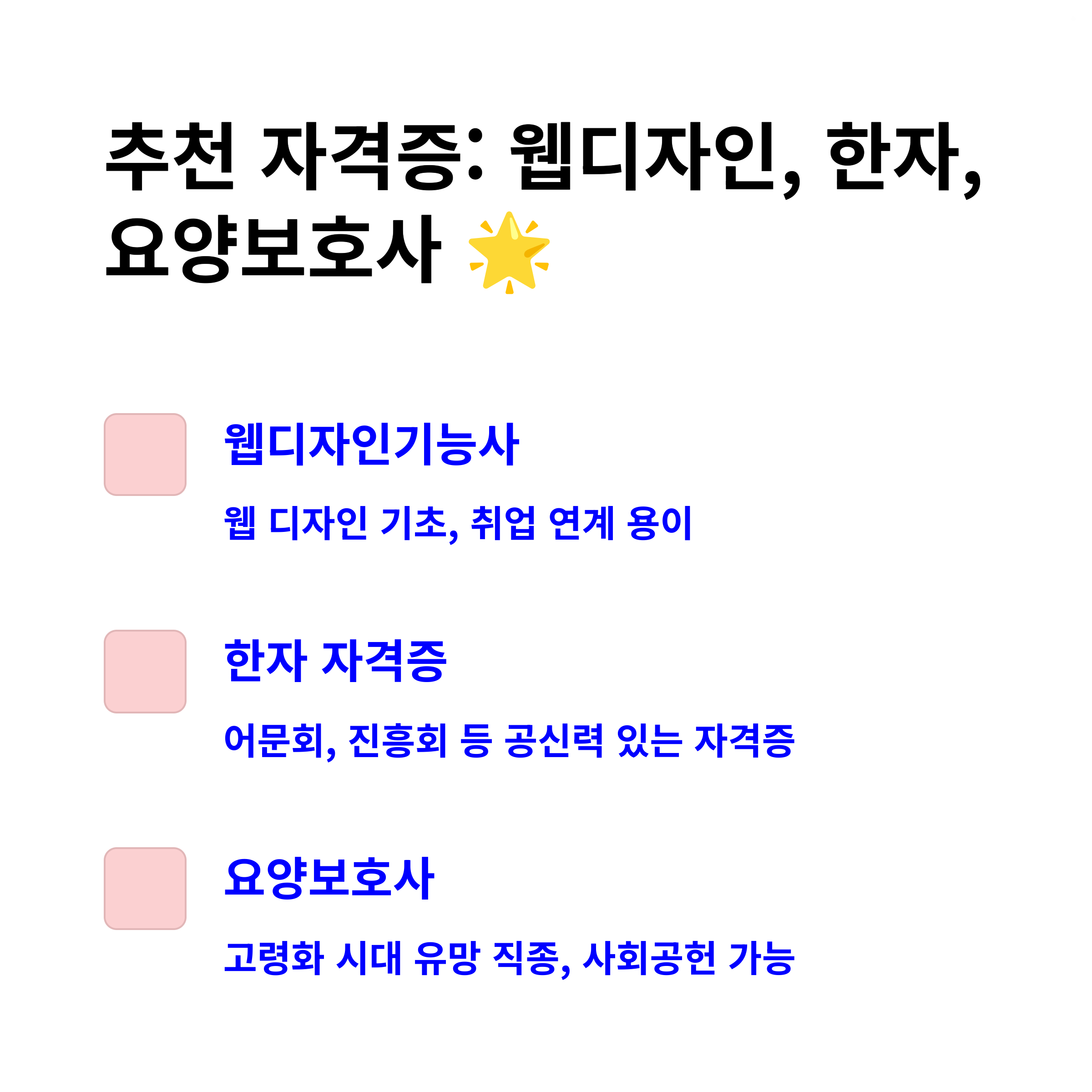 위에서 소개한 자격증 외에도 웹디자인기능사, 한자 자격증, 요양보호사 등의 자격증도 비교적 쉽게 취득할 수 있는 자격증으로 꼽힙니다. 각자의 관심 분야와 진로에 맞는 자격증을 선택하면, 취업이나 실무에서 더 큰 경쟁력을 가질 수 있습니다.