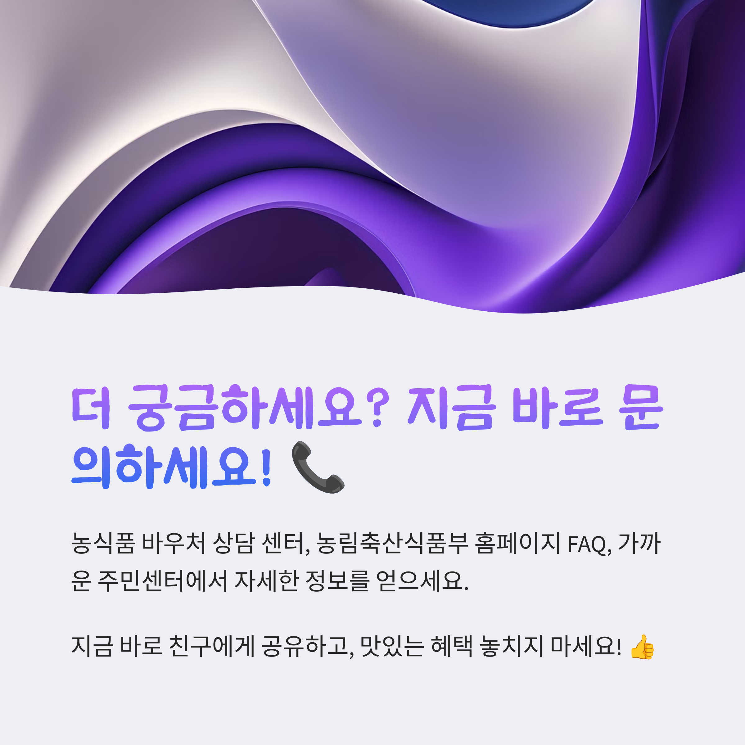 이제 농식품 바우처를 통해 더 많은 가정이 혜택을 받을 수 있도록, 주변의 도움이 필요한 사람들에게도 이 정보를 공유해 주세요. 건강한 식생활은 바로 여러분의 손에 달려 있습니다!