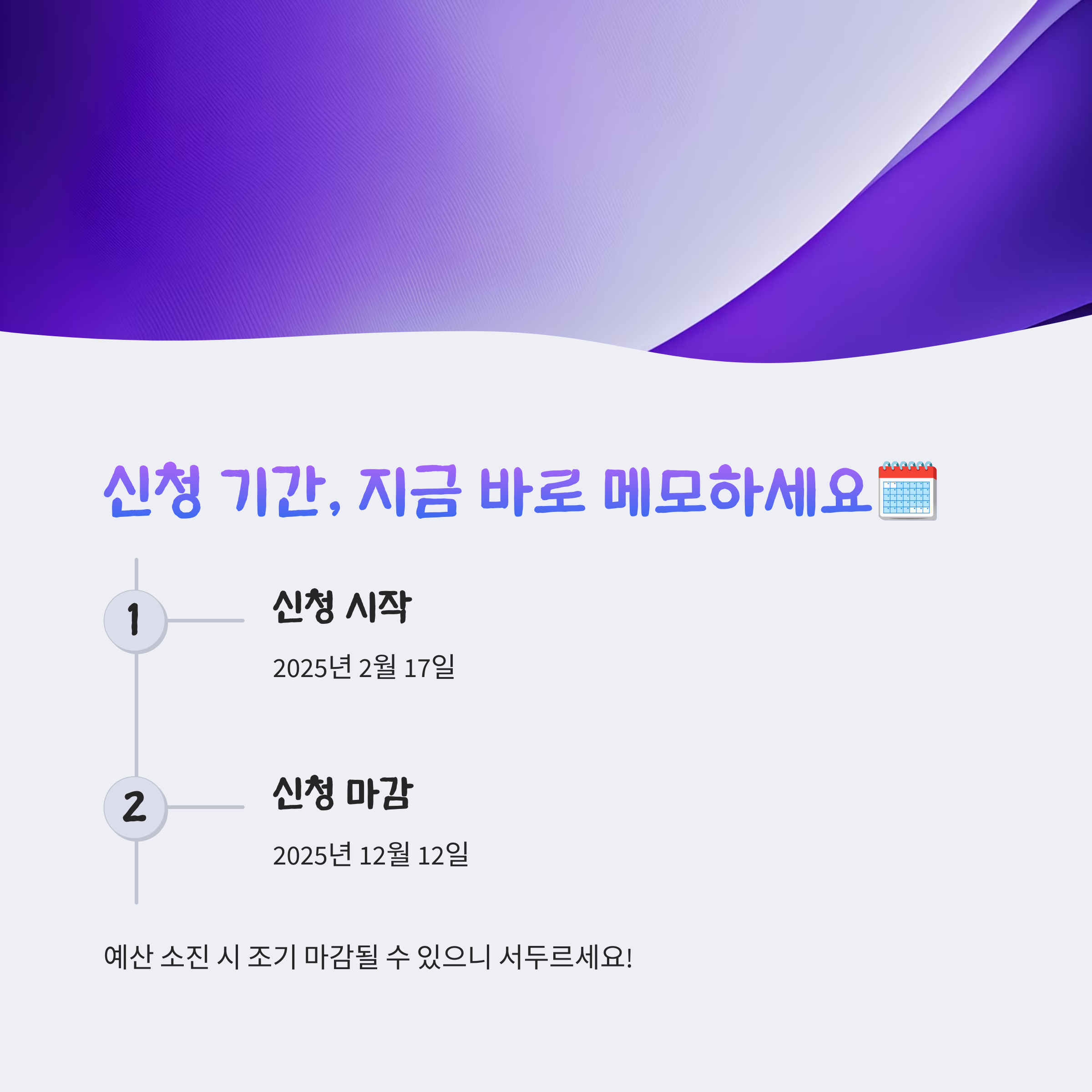2025년 2월 17일(월)부터 2025년 12월 12일(금)까지 신청이 가능합니다. 이 기간 내에 신청을 완료하면, 연말까지 지원을 받게 됩니다. 매월 자격 검증을 통해 지원 여부가 결정되므로, 매달 자격 요건을 충족하는지 확인할 필요가 있습니다.