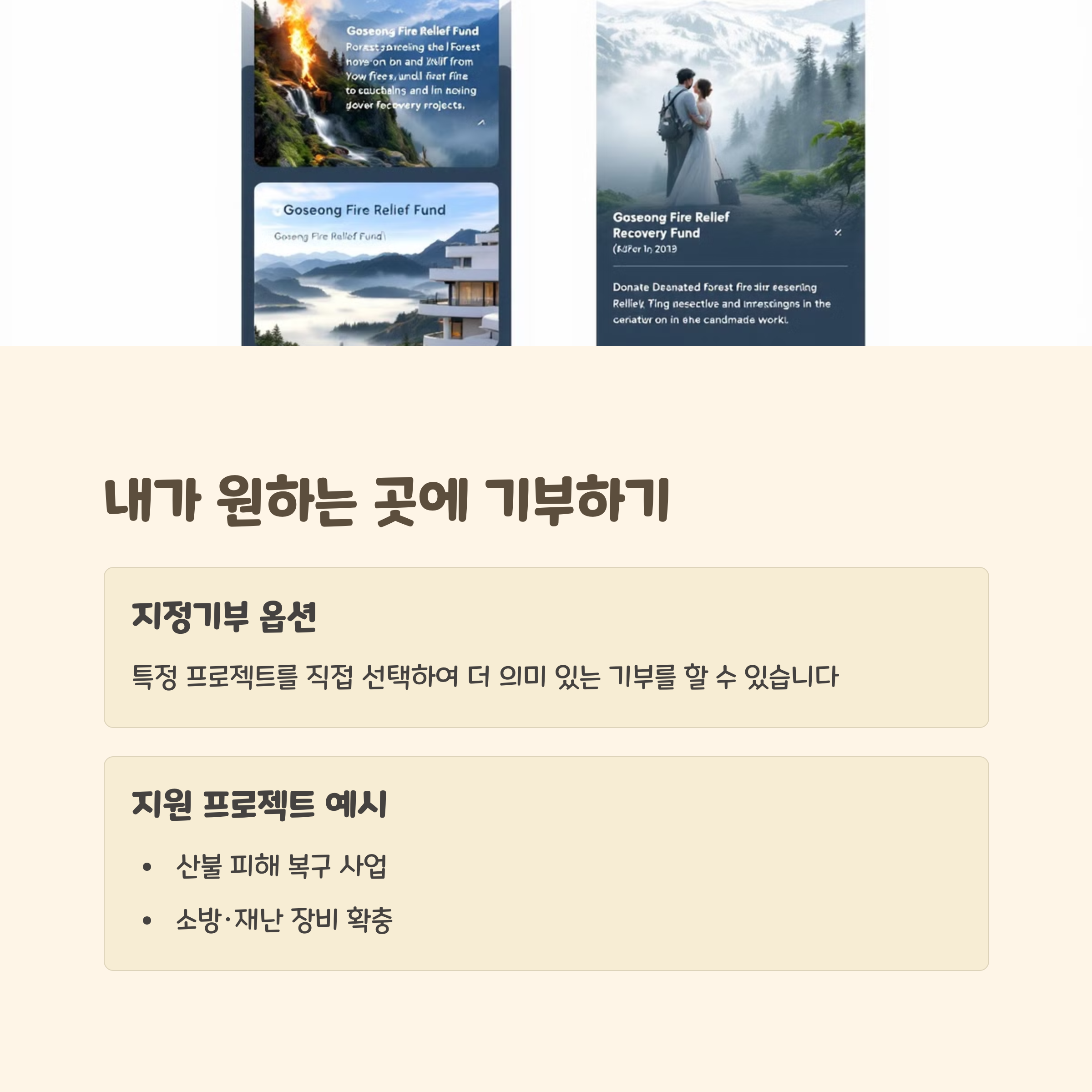 '고향사랑e음' 또는 위기브 플랫폼에서 지정기부 항목을 선택한 후, 원하는 지자체의 산불 복구 관련 프로젝트를 선택하면 됩니다. 보다 명확한 기부처와 용도를 선택할 수 있는 장점이 있습니다.