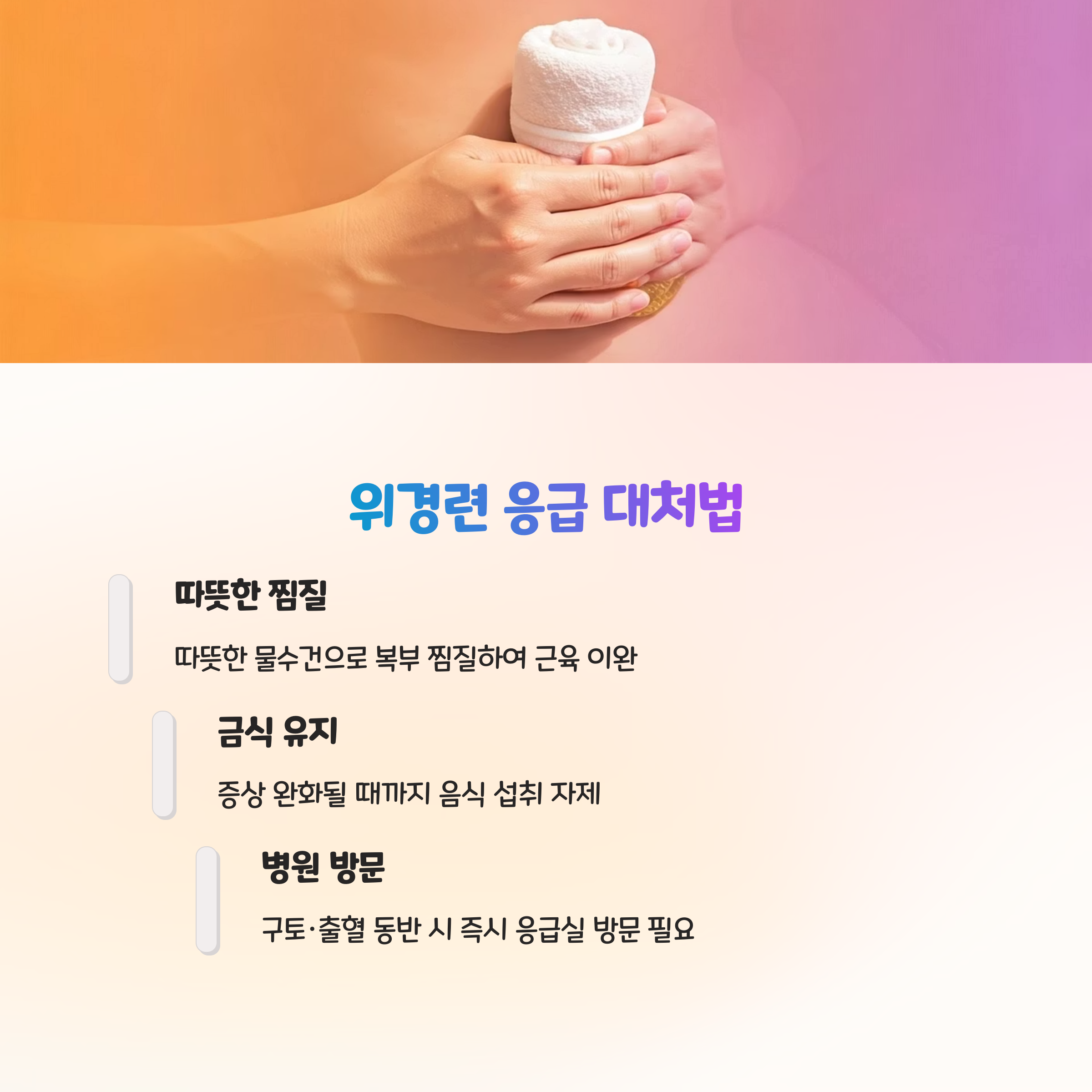 - 즉시 휴식 → 누운 자세에서 배를 따뜻하게 감싸기