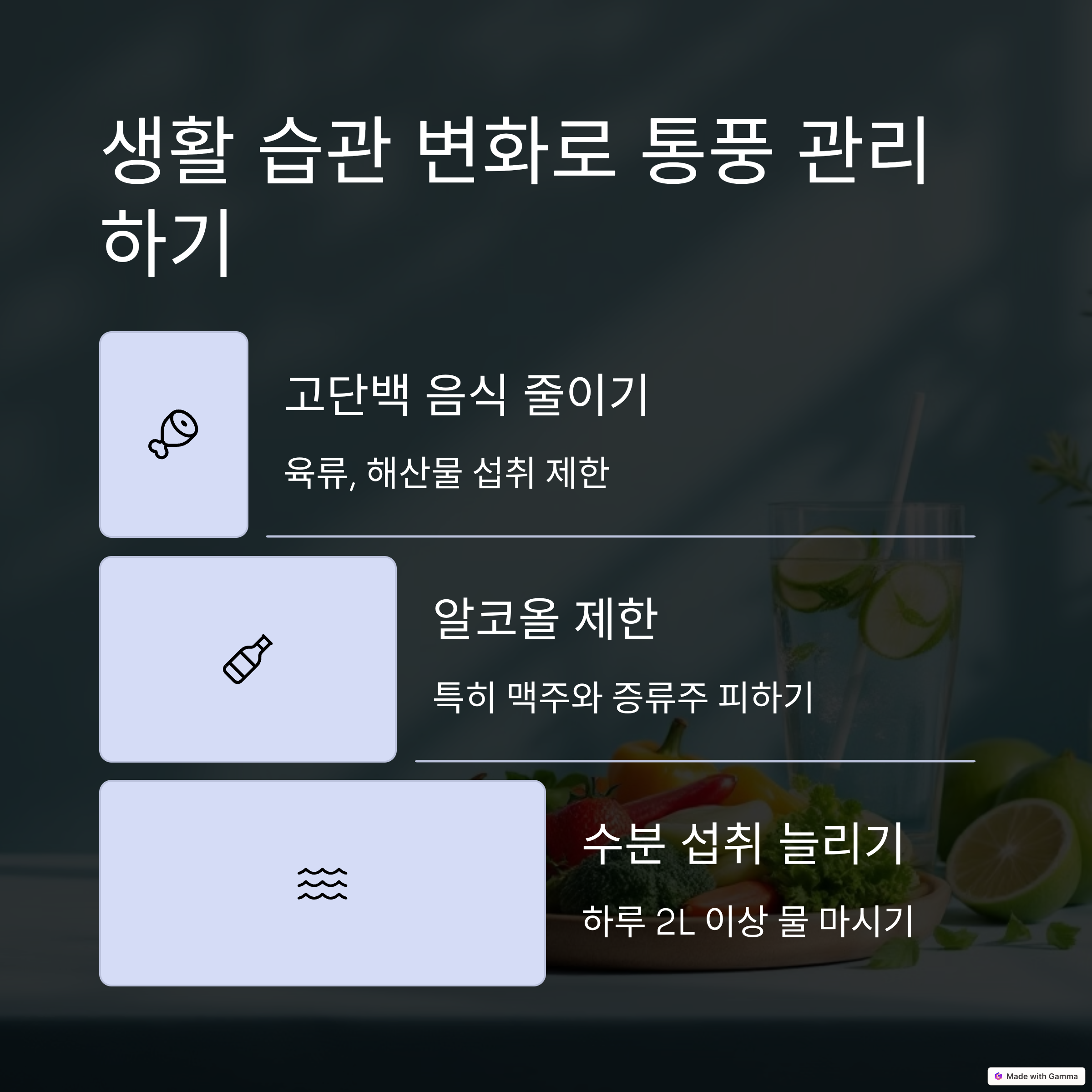 | 야간에 통증 심화, 열감 동반 가능 | 정기적인 검사로 수치 확인 필요 | 음주 줄이고 고단백 식품 제한 필요 |