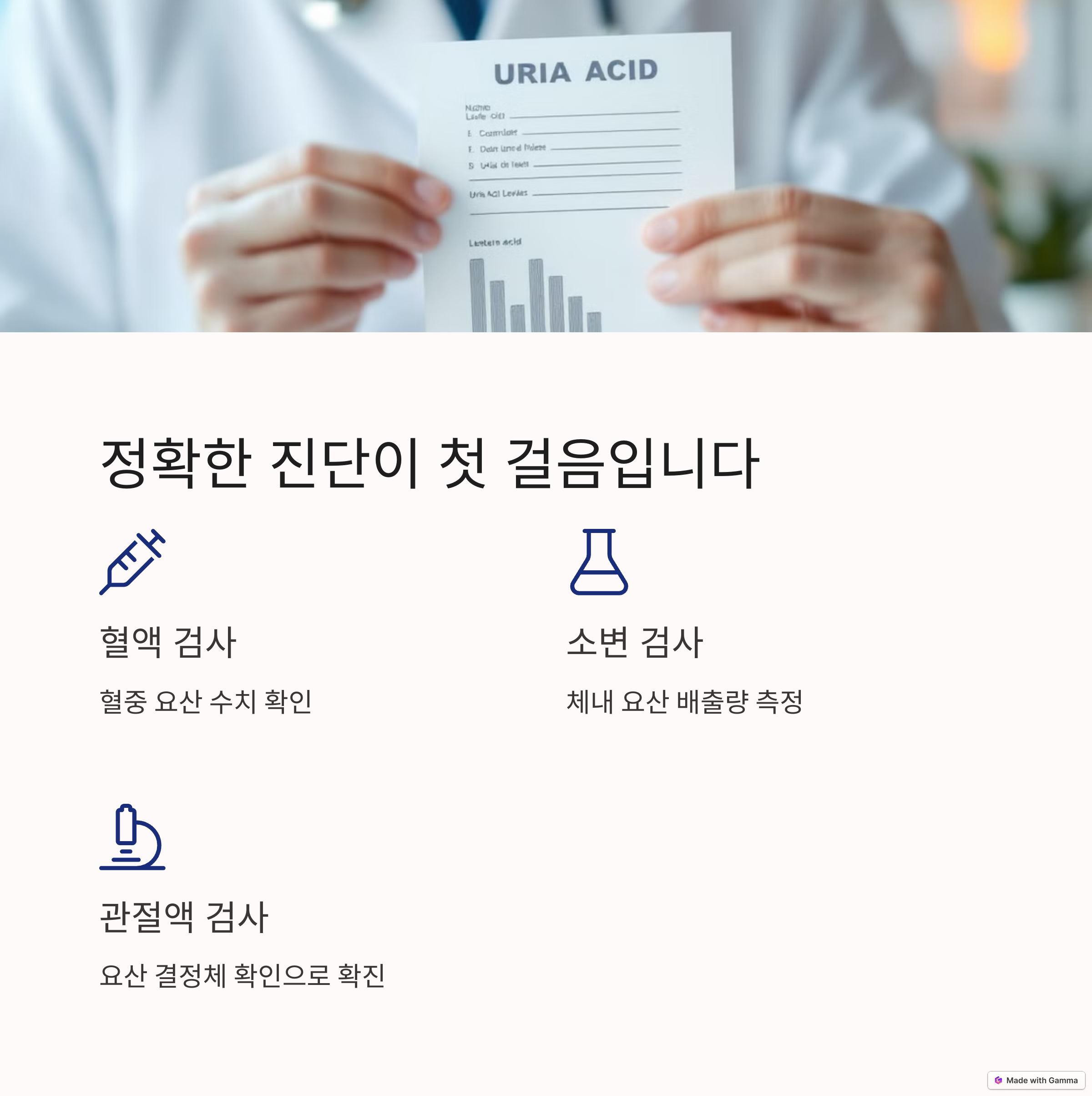 통풍을 정확히 진단하기 위해서는 혈액 검사, 소변 검사, 엑스레이 등의 의학적 진단이 필요합니다. 조기에 진단을 받고 적절한 약물 치료를 병행하면 증상 악화를 막을 수 있습니다. 진단 이후에는 꾸준한 관리가 중요한데, 특히 스트레스를 줄이고 충분한 휴식을 취하는 것이 도움이 됩니다. 정기적인 건강 검진을 통해 요산 수치를 체크하는 습관도 권장됩니다.