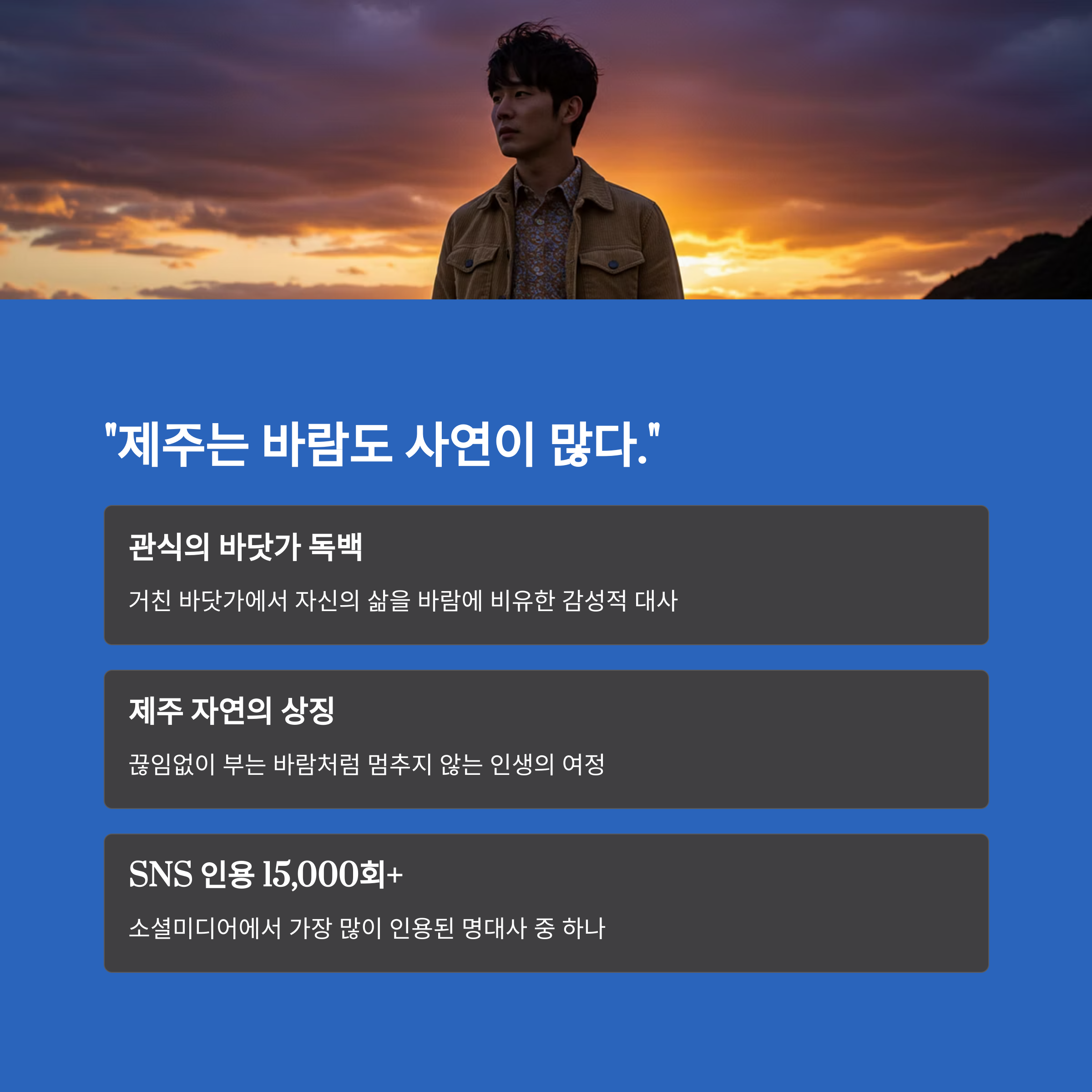 제주 방언이라는 지역적 특수성이 오히려 보편적 감정을 더 진하게 건드리기 때문이에요. 말투가 다르면 정서가 더 깊게 느껴질 때가 있잖아요.