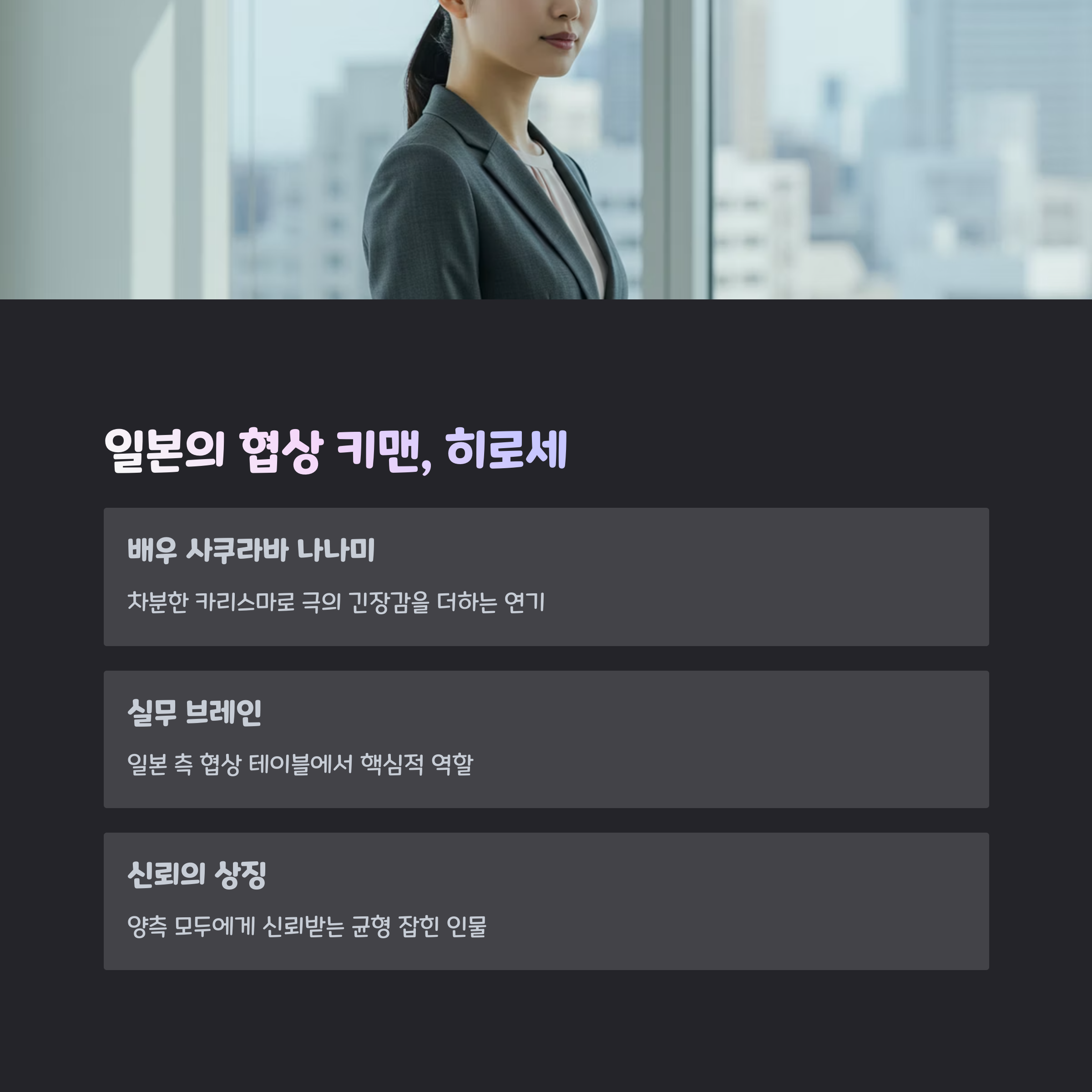 안녕하세요, 드라마 마니아 여러분! 오늘은 제가 푹 빠졌던 JTBC 오피스 드라마 '협상의 기술' 속 등장인물들과 특히 인상 깊었던 일본 측 인물 히로세 캐릭터에 대해 파헤쳐볼게요. 단순한 조연이라기엔 너무 큰 임팩트를 남긴 그 캐릭터, 과연 어떤 인물이었을까요?