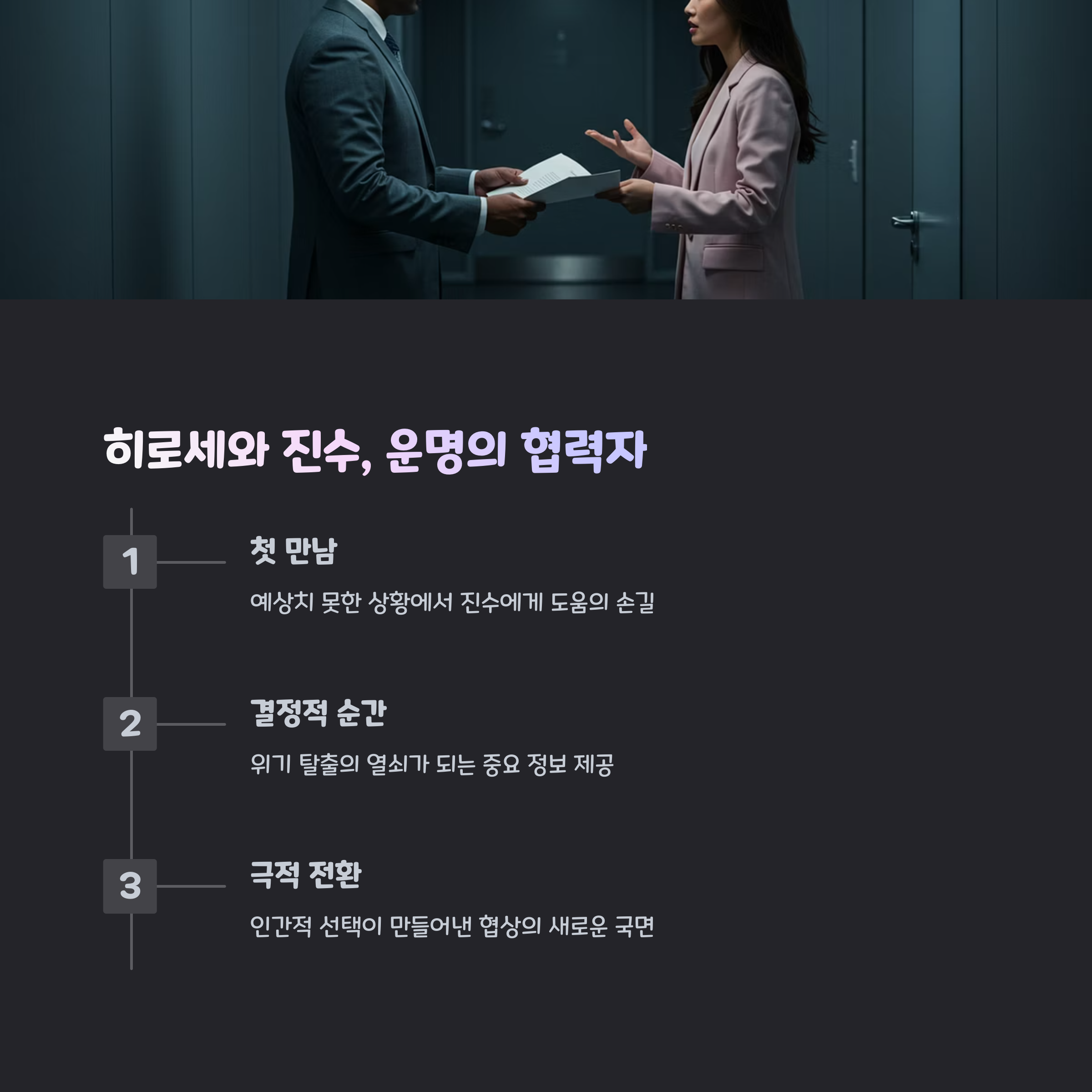 히로세는 단순한 외부 인물이 아니었어요. 극 중반 이후, 주노 팀이 벼랑 끝에 몰렸을 때 새로운 카드를 제공하는 역할을 하며 극의 방향을 바꾸는 전환점을 만들어냅니다. 이 인물이 없었다면 M&A 협상은 전혀 다른 방향으로 흘러갔을지도 몰라요.