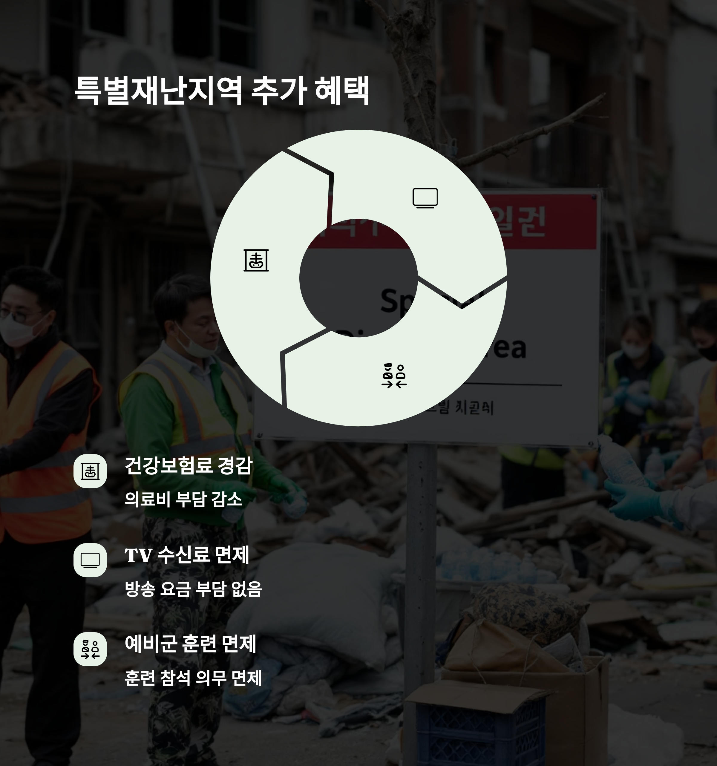 | 주택복구, 농·임업 융자, 중소기업 긴급자금, 법률·의료상담 | 국세 유예, 지방세 감면, 공공요금 감면(전기·가스·통신·수도) | 건강보험료 경감, TV수신료 면제, 예비군 훈련 면제 |