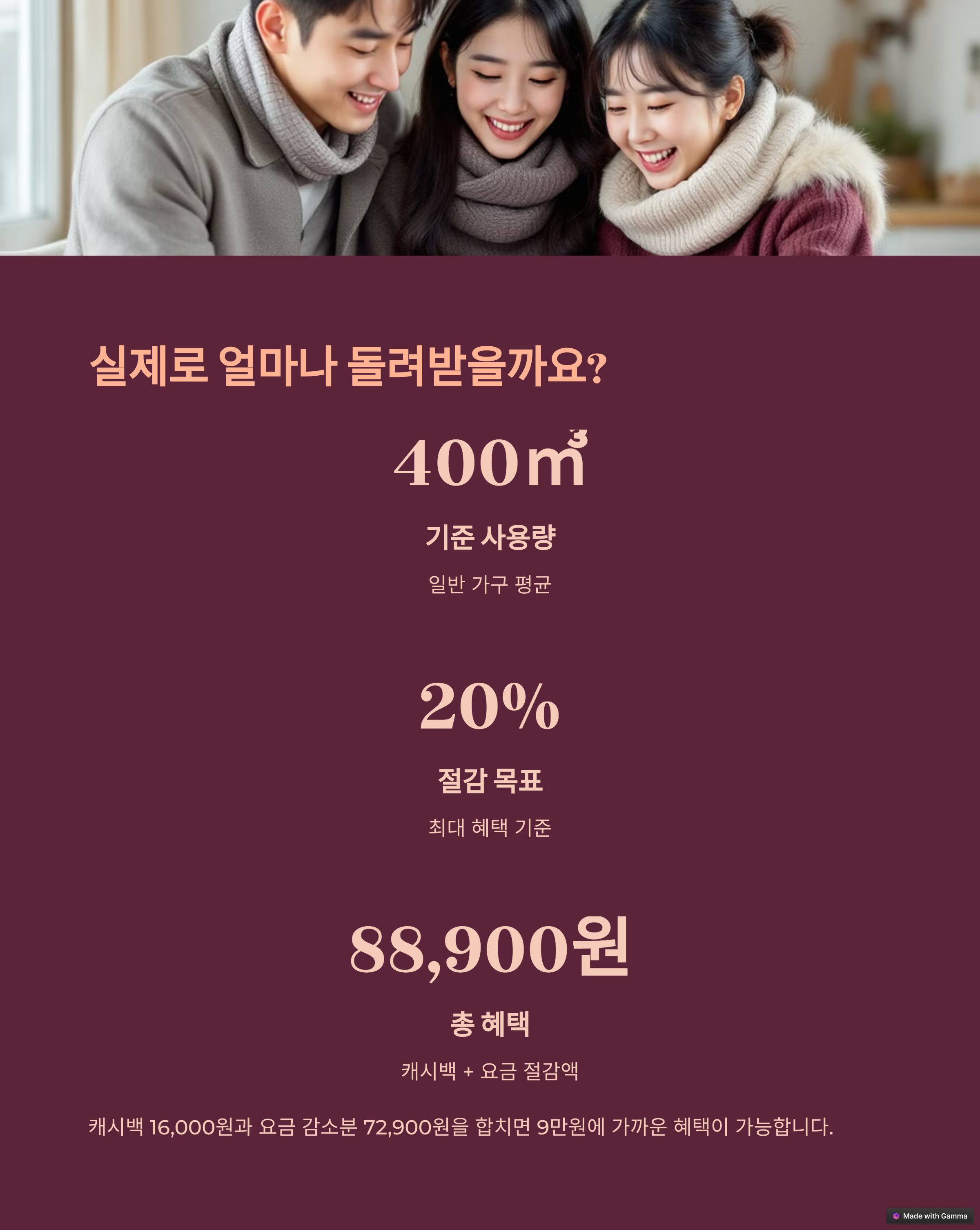 | 최대 캐시백 | 절감량에 따라 최대 200원/㎥, 평균 9만 원 환급 |