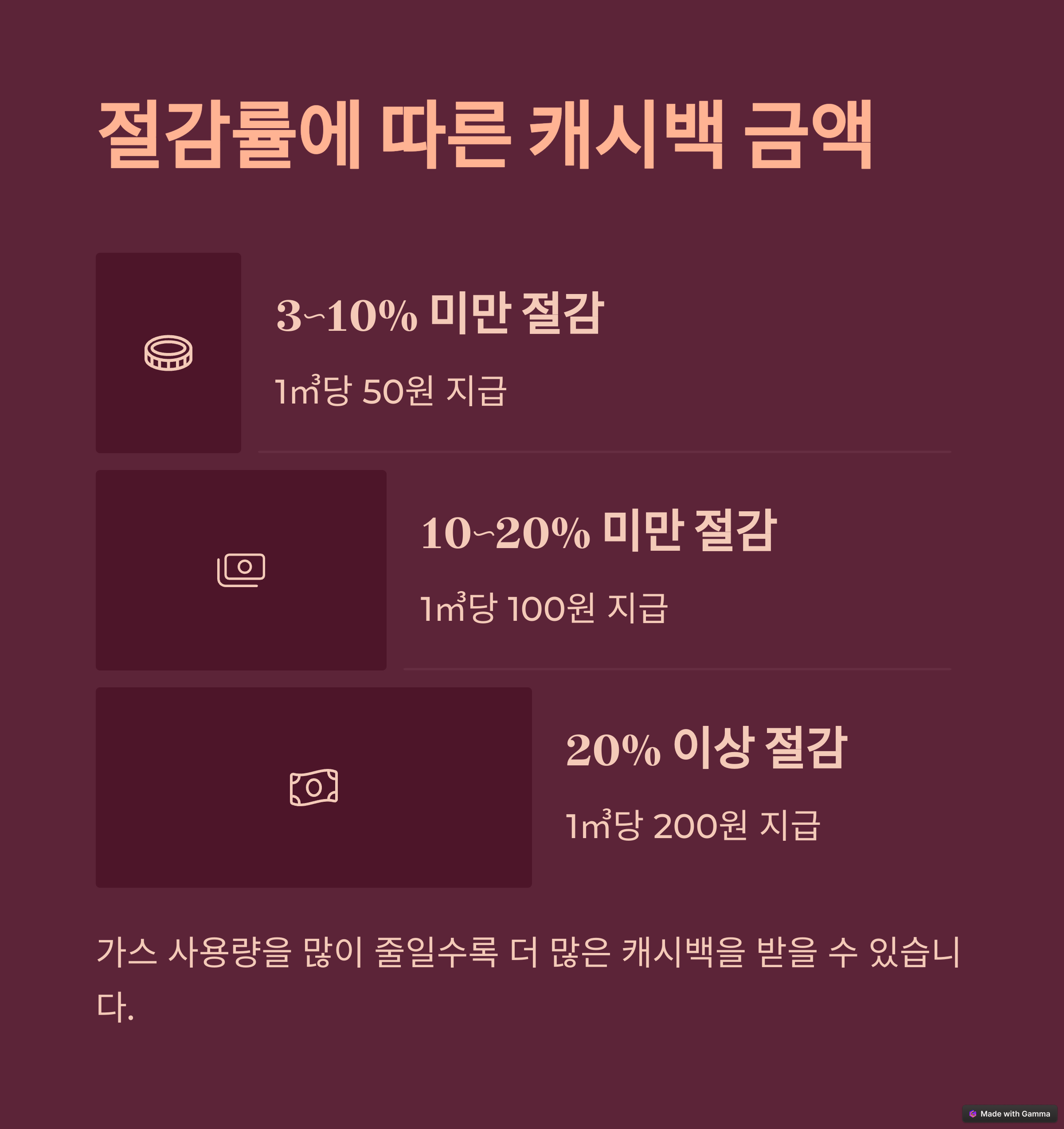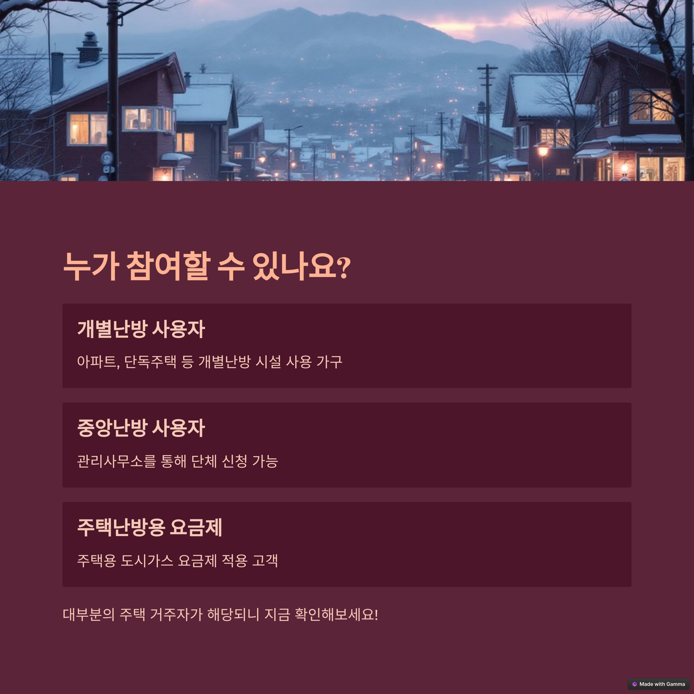 | 3% 이상 10% 미만: 50원/㎥ 10% 이상: 최대 200원/㎥ | 공식 사이트에서 고객식별번호 입력 후 신청 | 2025년 3월 31일까지 신청 필수, 조기 마감 가능성 있음 |