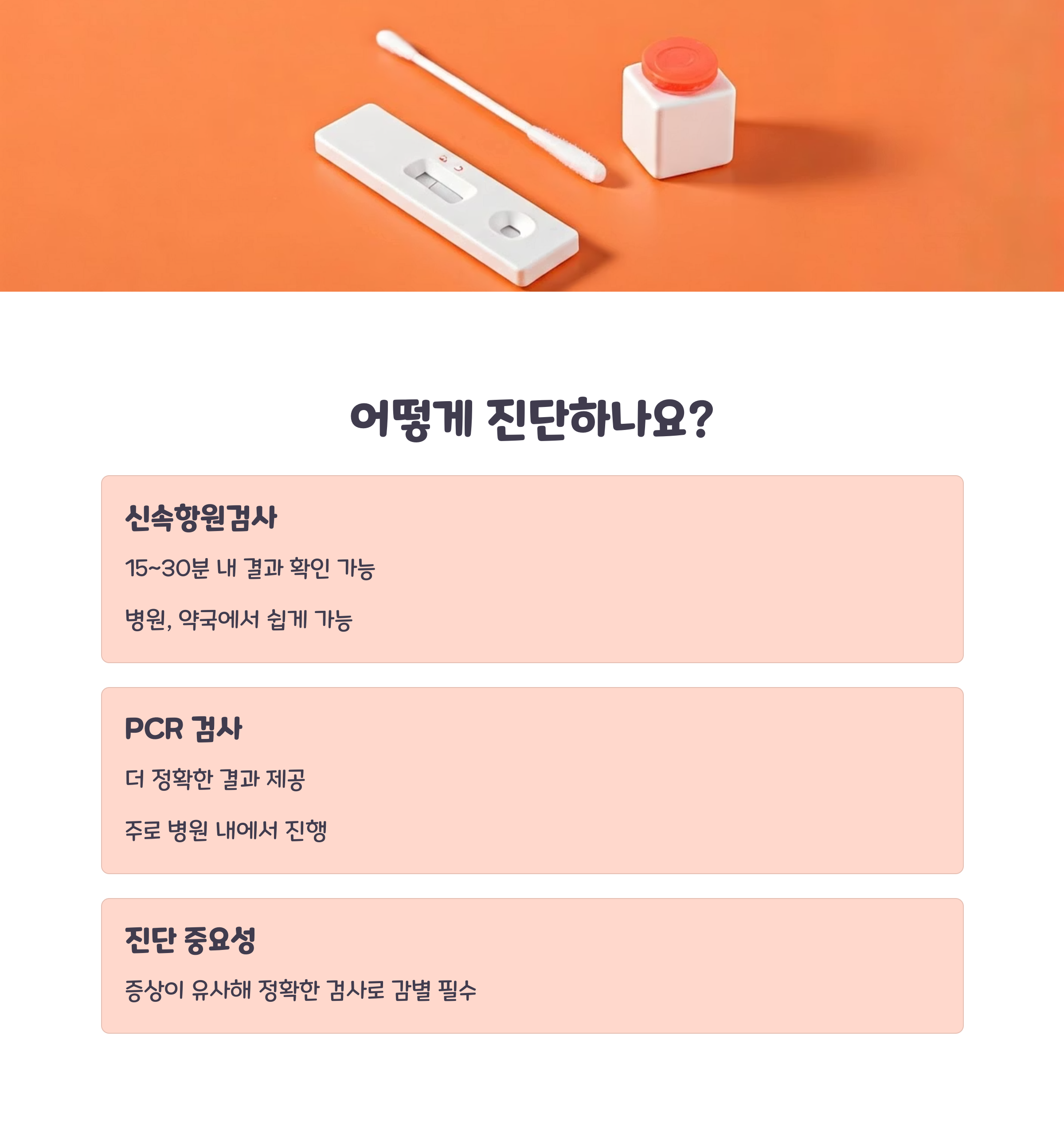 A형과 B형 모두 신속항원검사 또는 PCR 검사로 진단이 가능합니다.