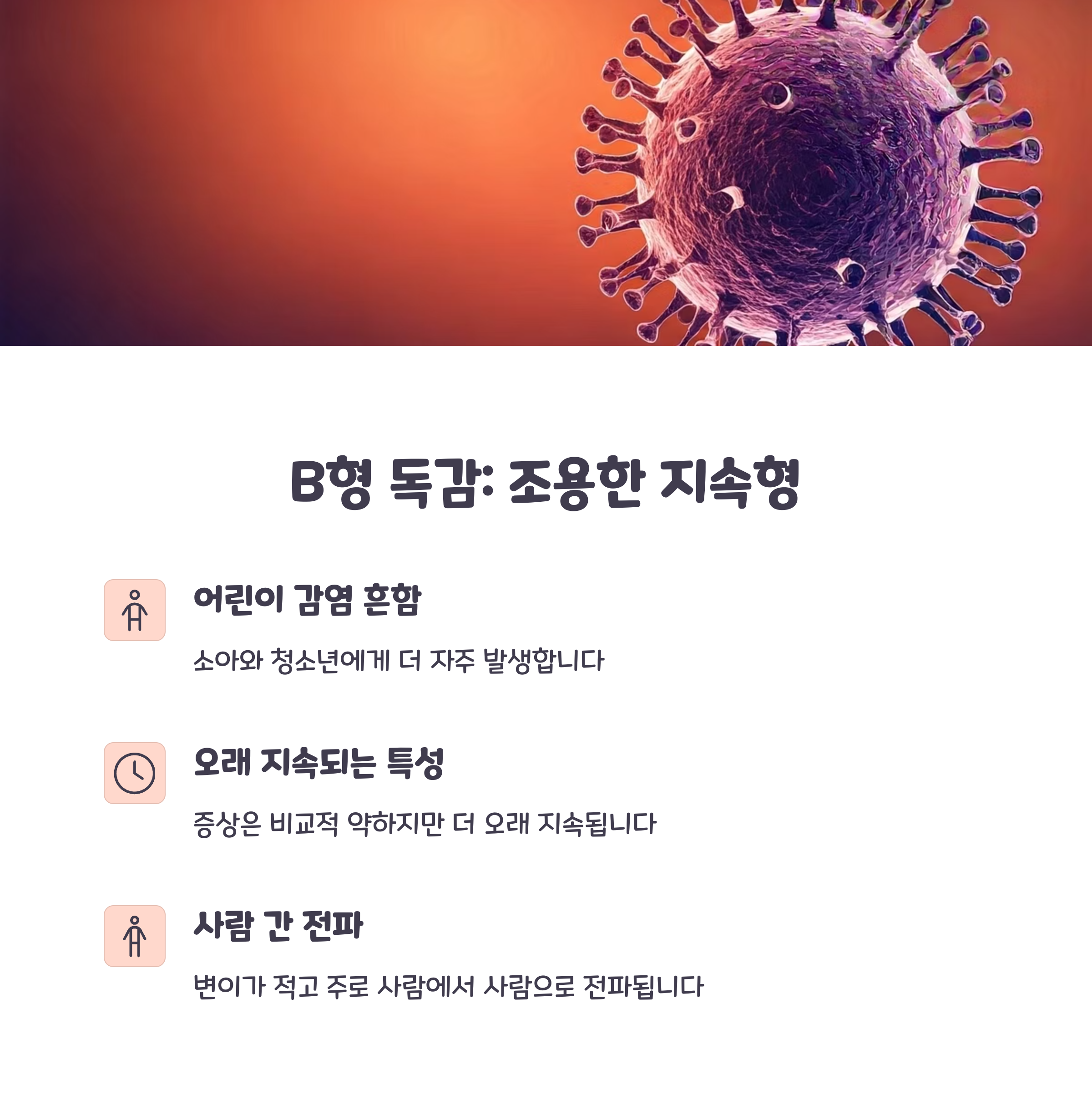 A형보다는 전염력은 약하지만 증상이 오래 지속되는 경향이 있습니다.