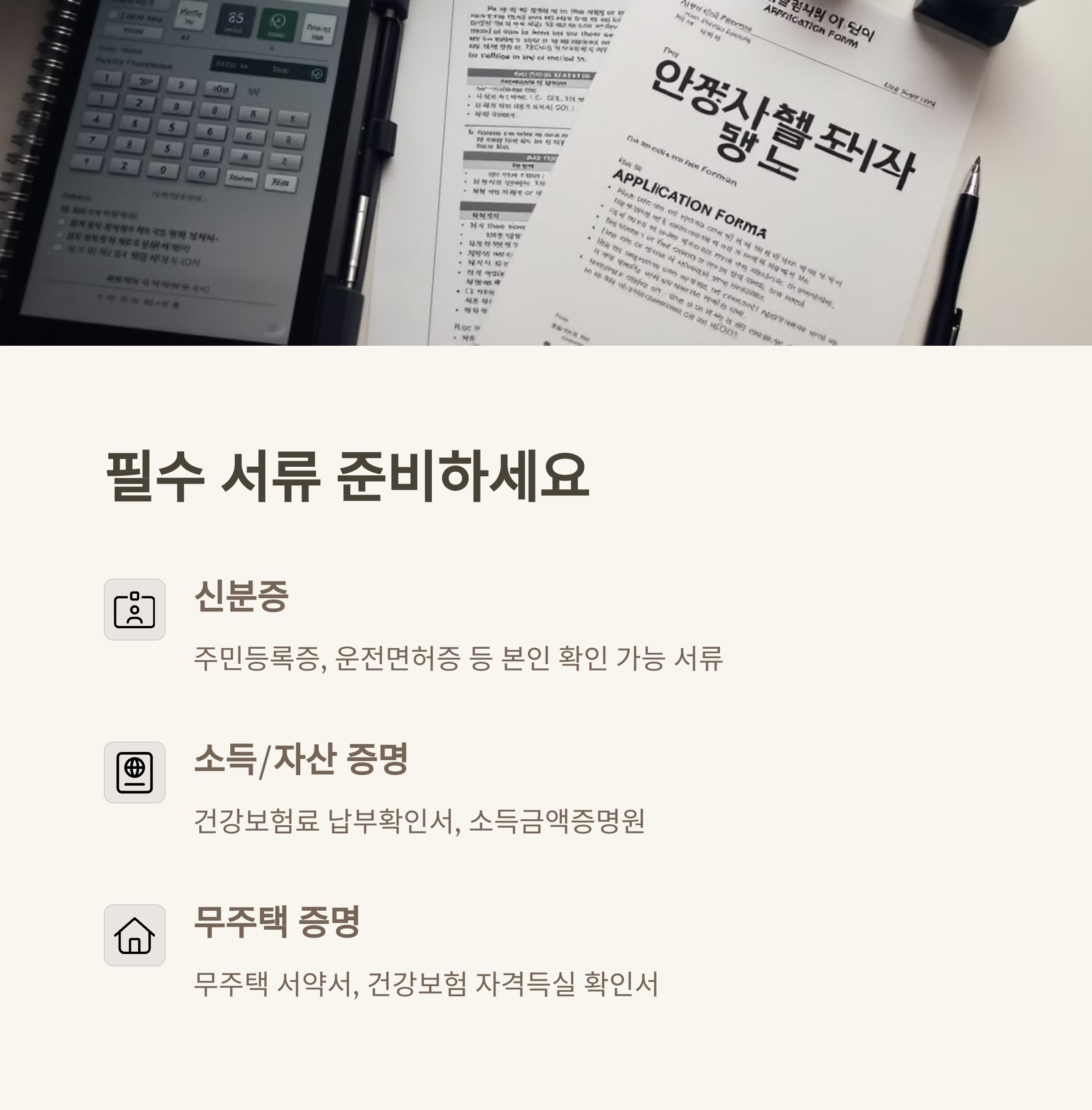 다음은 LH 청년매입임대주택을 신청하기 위해 필요한 서류 목록입니다. 미리 준비해두면 빠르게 신청을 완료할 수 있습니다.